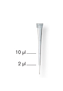 吸頭外形修長,長度46 mm,移液時不會觸碰到微量儲存管管壁或微孔板板壁。吸頭 于2 μl及10 μl處有刻度標(biāo)記,便于快速檢查體積。預(yù)裝移液器吸頭無色透明,放置于一 個灰色的吸頭托架上。